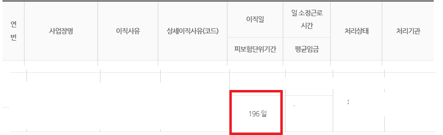 하지만! 제가 알아본 결과, 전혀 걱정을 하지 않아도 되는 사항이었습니다. 실업급여 수급 조건인 180일 이상이라는 조건을 충족하게 되면 그 뒤의 날짜는 의미가 없게 되는데요. 그래서 고용청에서도 피보험단위기간을 기입할 때, 180일이상의 기간이라면 196일 혹은 212일 등으로 간략하게 기입을 한다고 합니다. 아무래도 180일 이상이라는 최소 조건을 충족하였기에 그 이상의 계산은 불필요하기에 이뤄진 조치가 아닌가 싶네요.